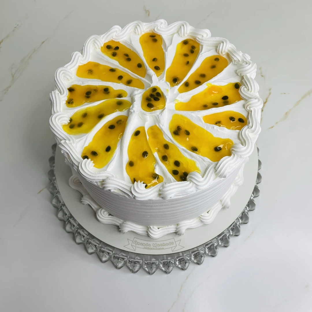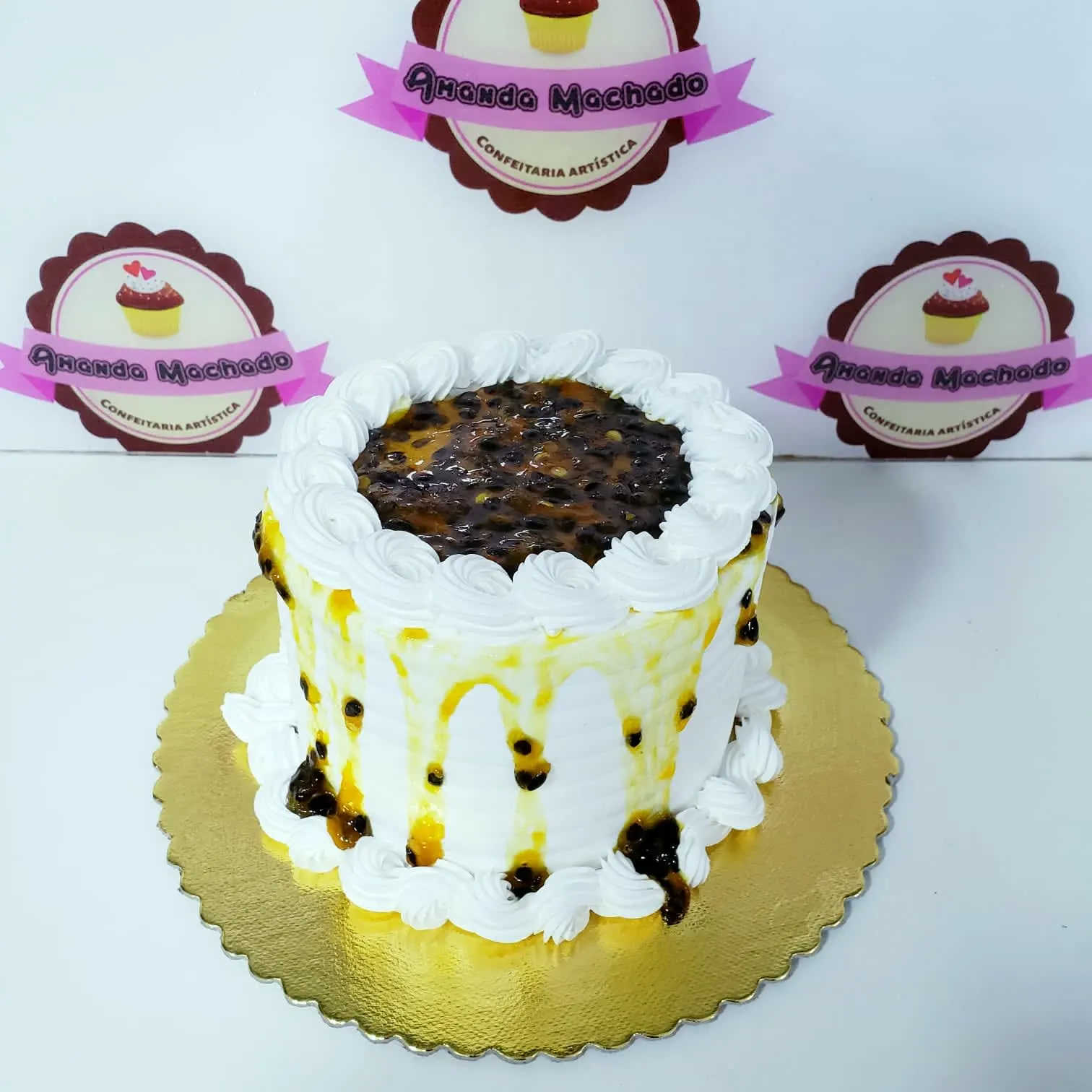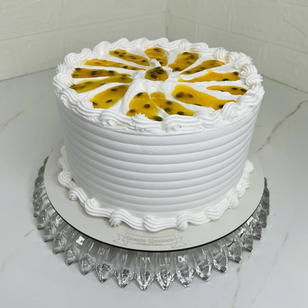 Bolo branco, recheio mousse de maracuja. Decoração Tradicional com chantilly e calda de maracuja
