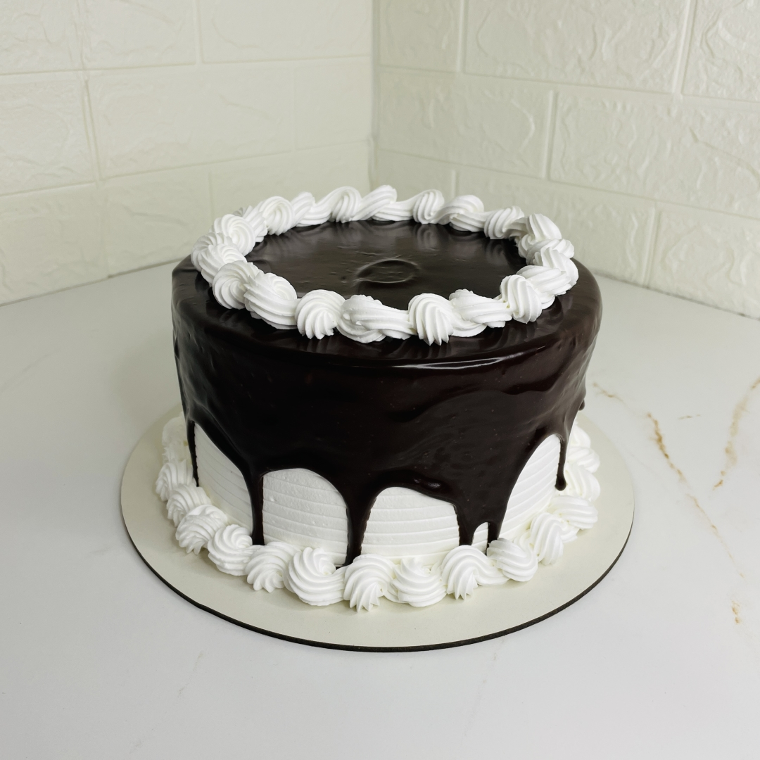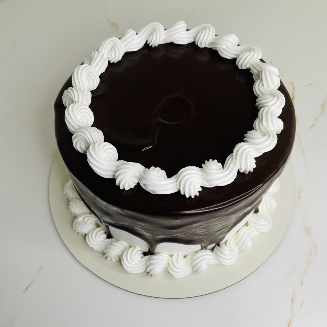 Bolo de chocolate ou branco recheio de creme e pedaços de chocolate. Decoração Tradicional com chantilly e calda de chocolate.