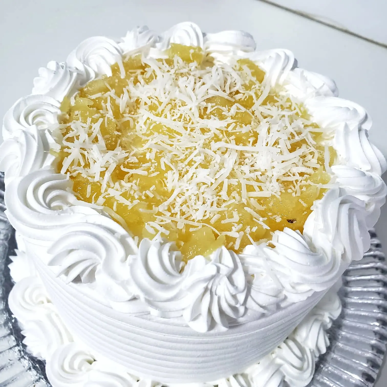 Bolo branco ,recheio de creme com abacaxi e coco. Decoração Tradicional com chantilly, coco e abacaxi.