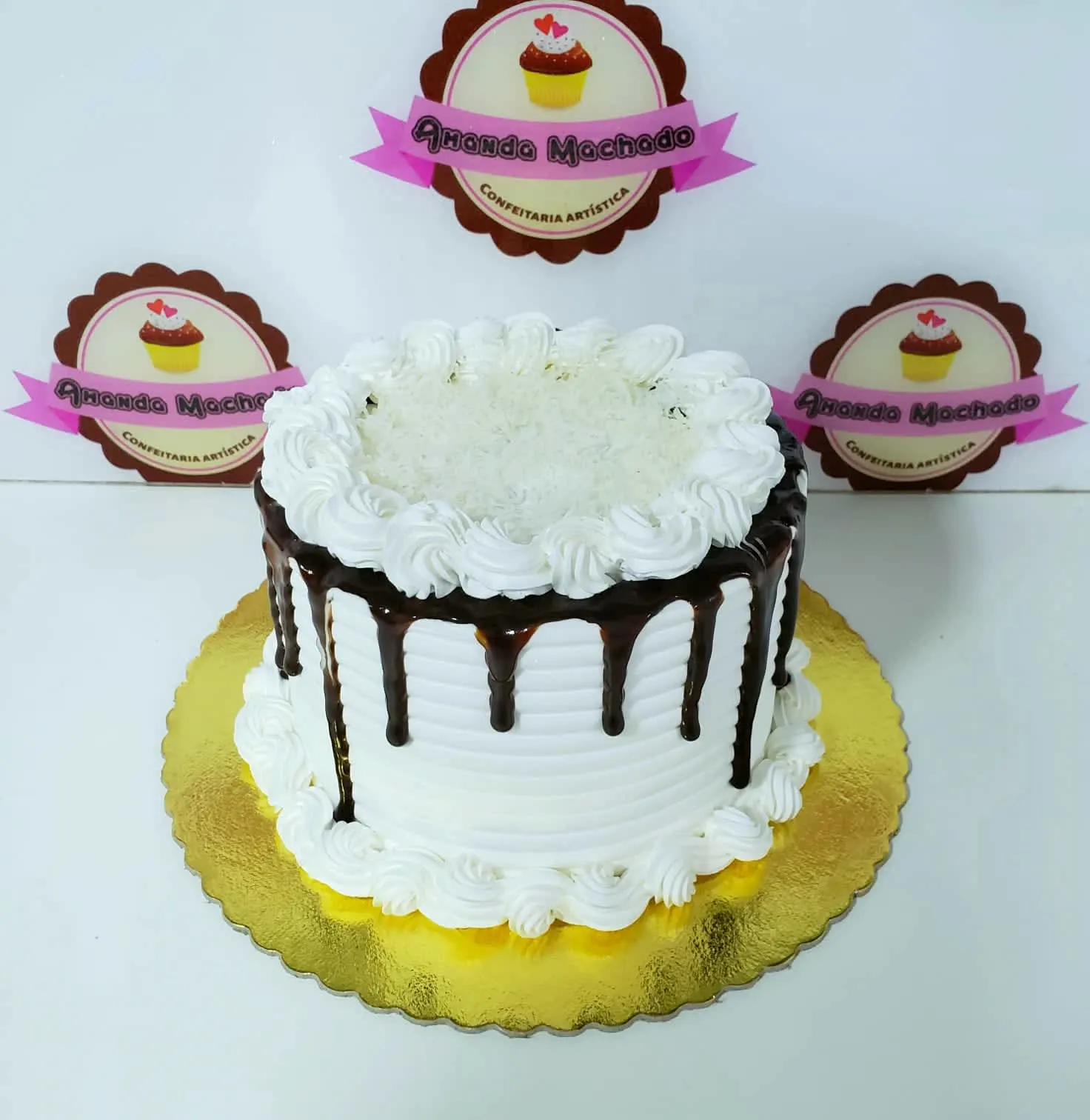 Bolo branco, recheio de brigadeiro creme com coco. Decoração Tradicional com chantilly, calda de chocolate e coco.