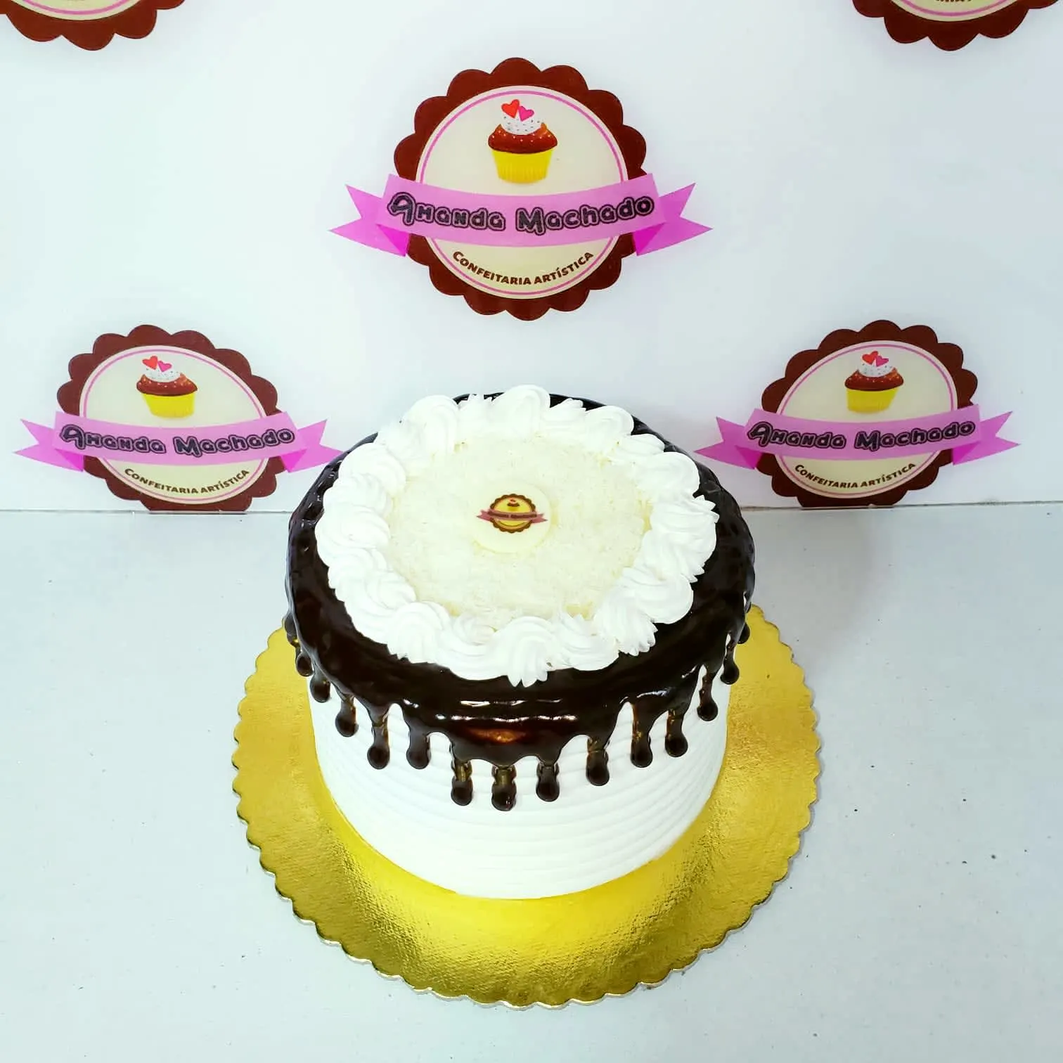 Bolo branco, recheio de creme com bombom ouro branco e chantilly. Decoração Tradicional com chantilly, calda de caramelo e bombom ouro branco.