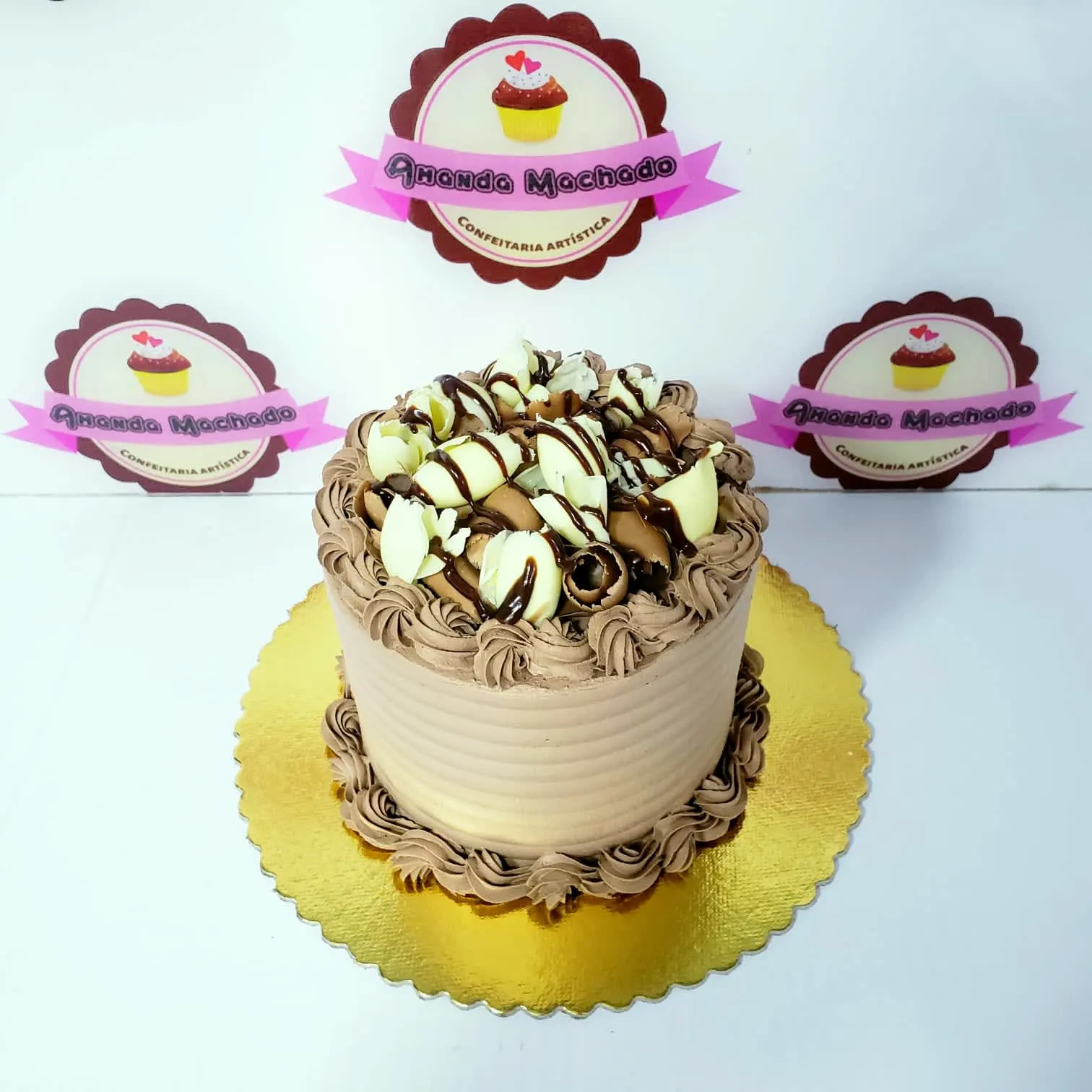 Bolo de chocolate recheio de creme e doce de brigadeiro. Decoração Tradicional com CHANTILLY DE CHOCOLATE raspas de chocolate preto e branco e calda de chocolate.