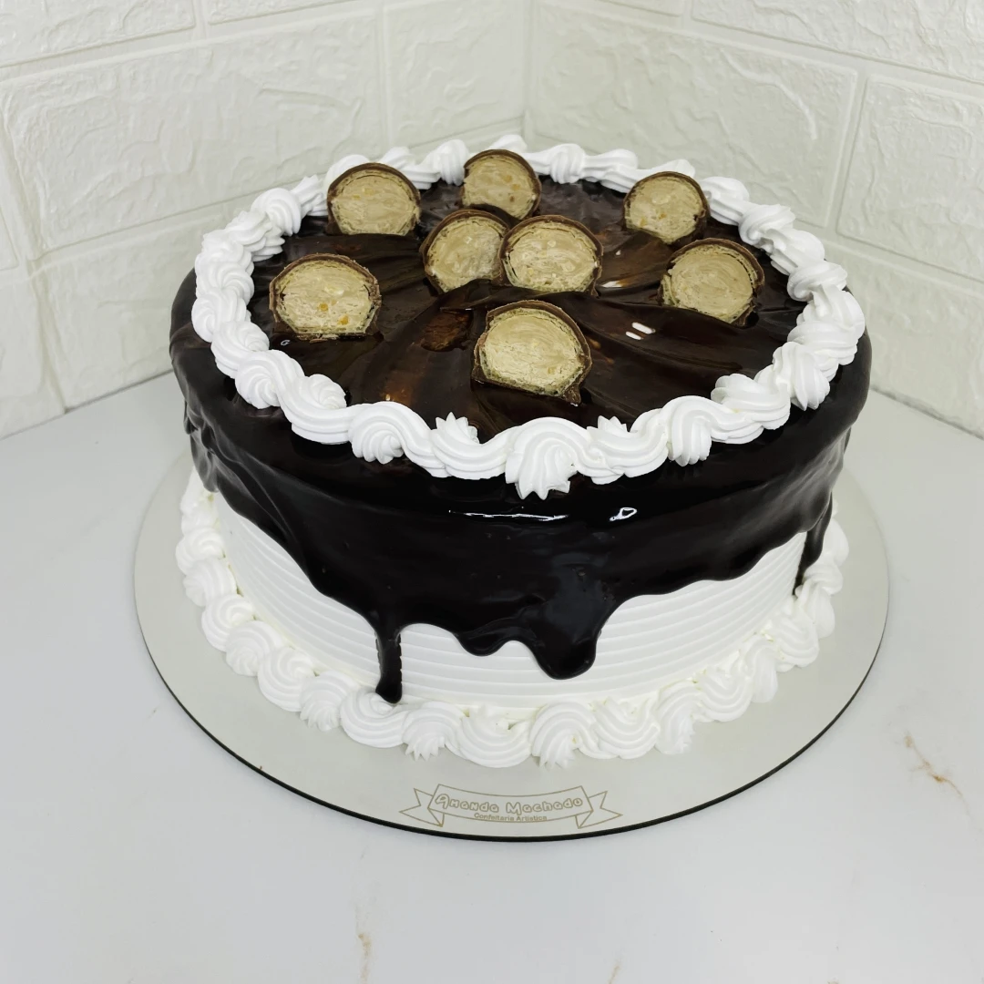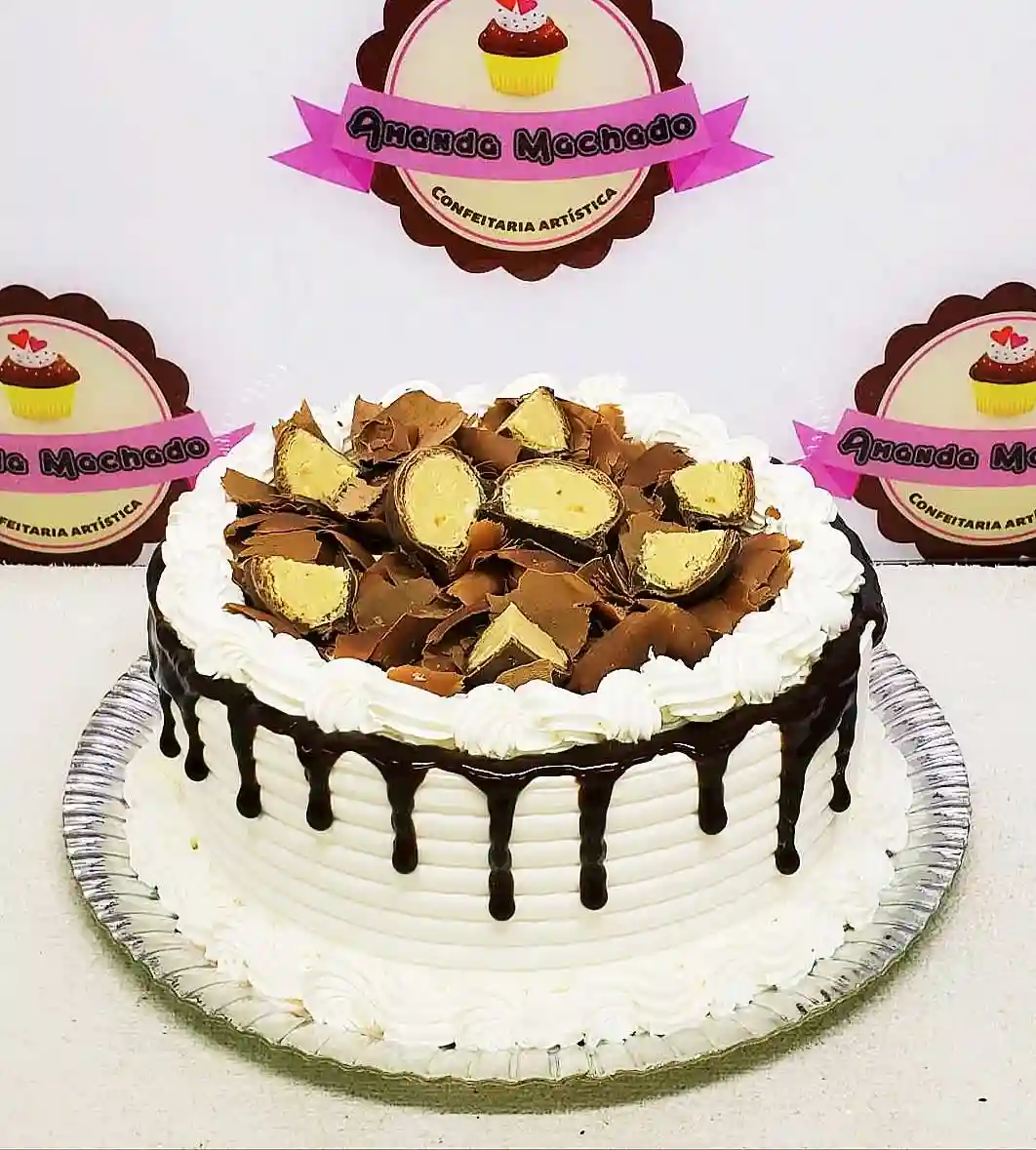 Bolo de chocolate, recheio de trufa de chocolate, recheio de creme com bombom. Decoração Tradicional com chantilly e bombom sonho de valsa.