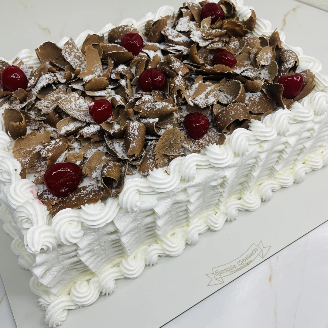 Massa branca, 2 camadas de recheio. 1ª camada leite condensado moça 2ª camada nata e pedaços de morango. Decoração Tradicional com chantilly, raspas de chocolate branco e morangos