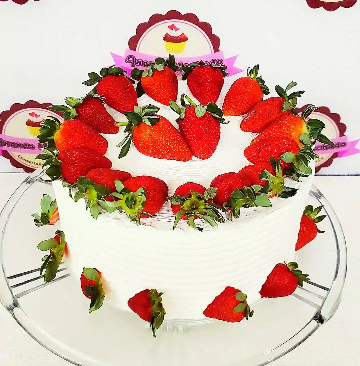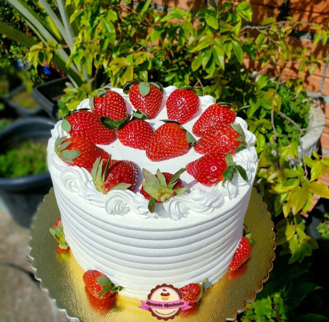 Bolo branco, recheio de creme com morango. Decoração Tradicional com Chantilly e morangos.