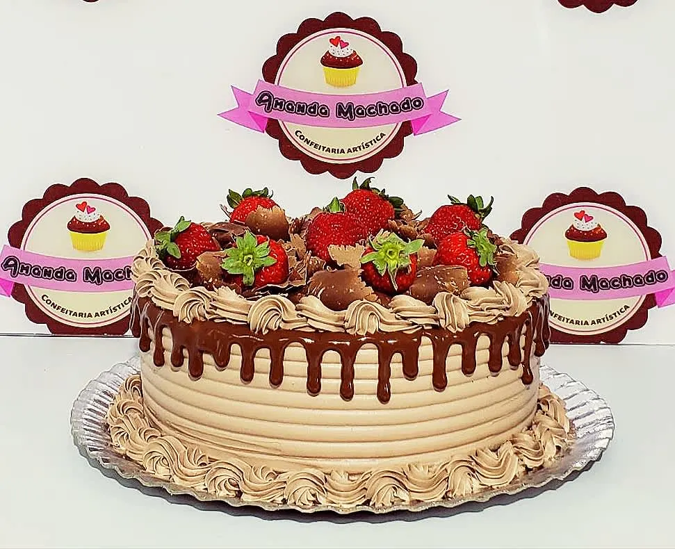 Bolo de chocolate, recheio de trufa de chocolate creme e morango Decoração Tradicional com chantilly de chocolate, calda, raspas de chocolate e morangos