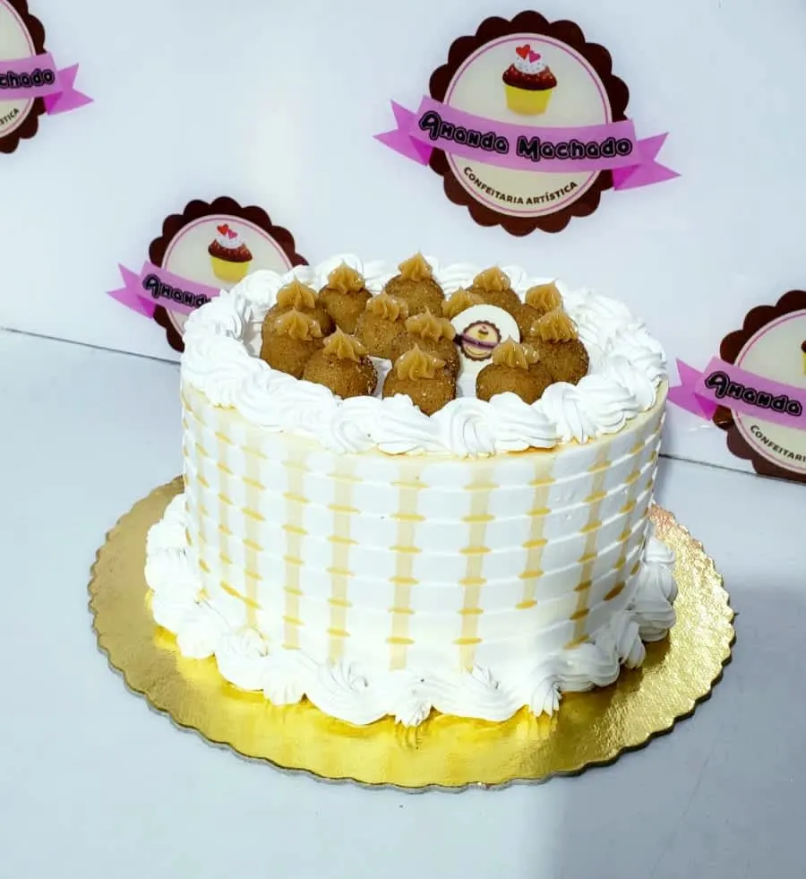 Massa branca, recheio de churros moça e doce de leite. Decoração Tradicional com chantilly e brigadeiro de churros