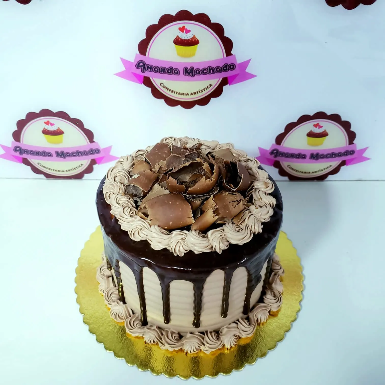 Bolo de chocolate recheio de trufa de chocolate MEIO AMARGO. Decoração Tradicional com CHANTILLY DE CHOCOLATE, calda de chocolate e raspas de chocolate.