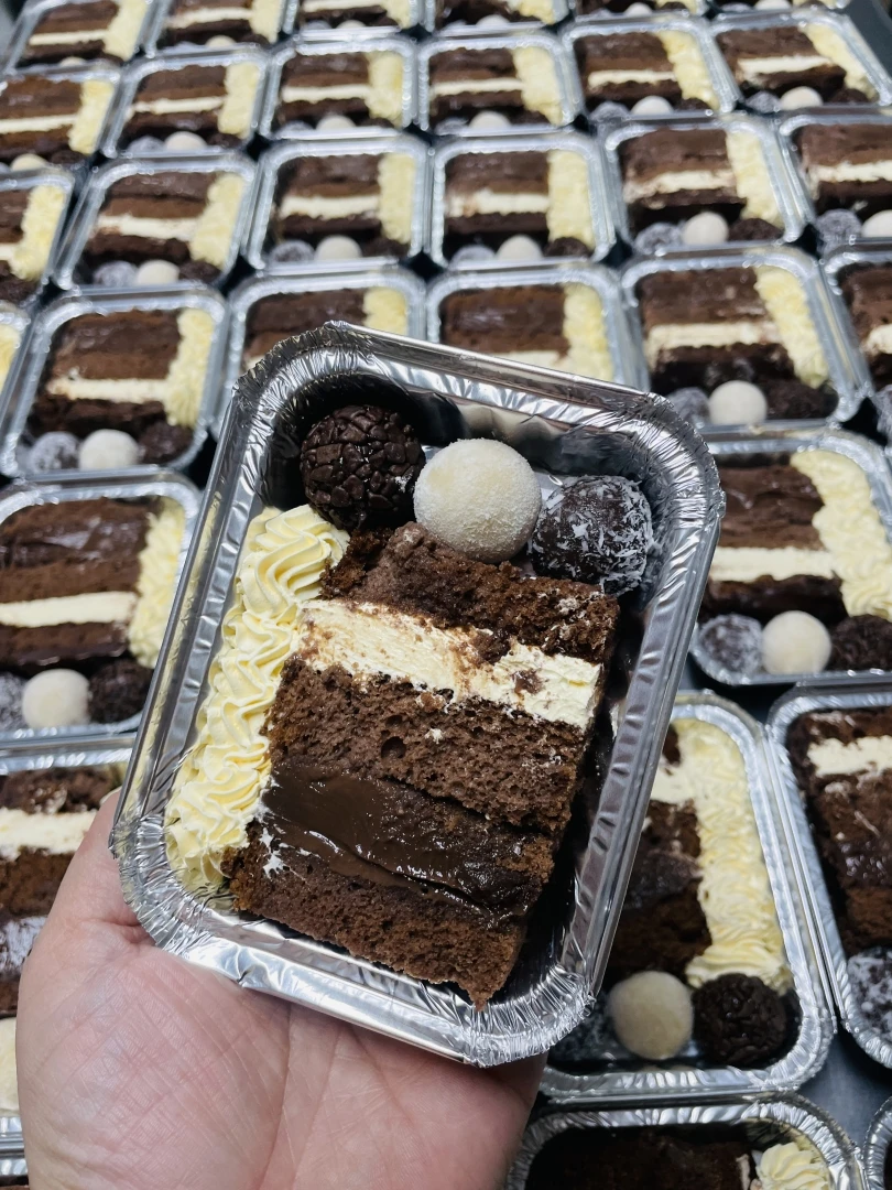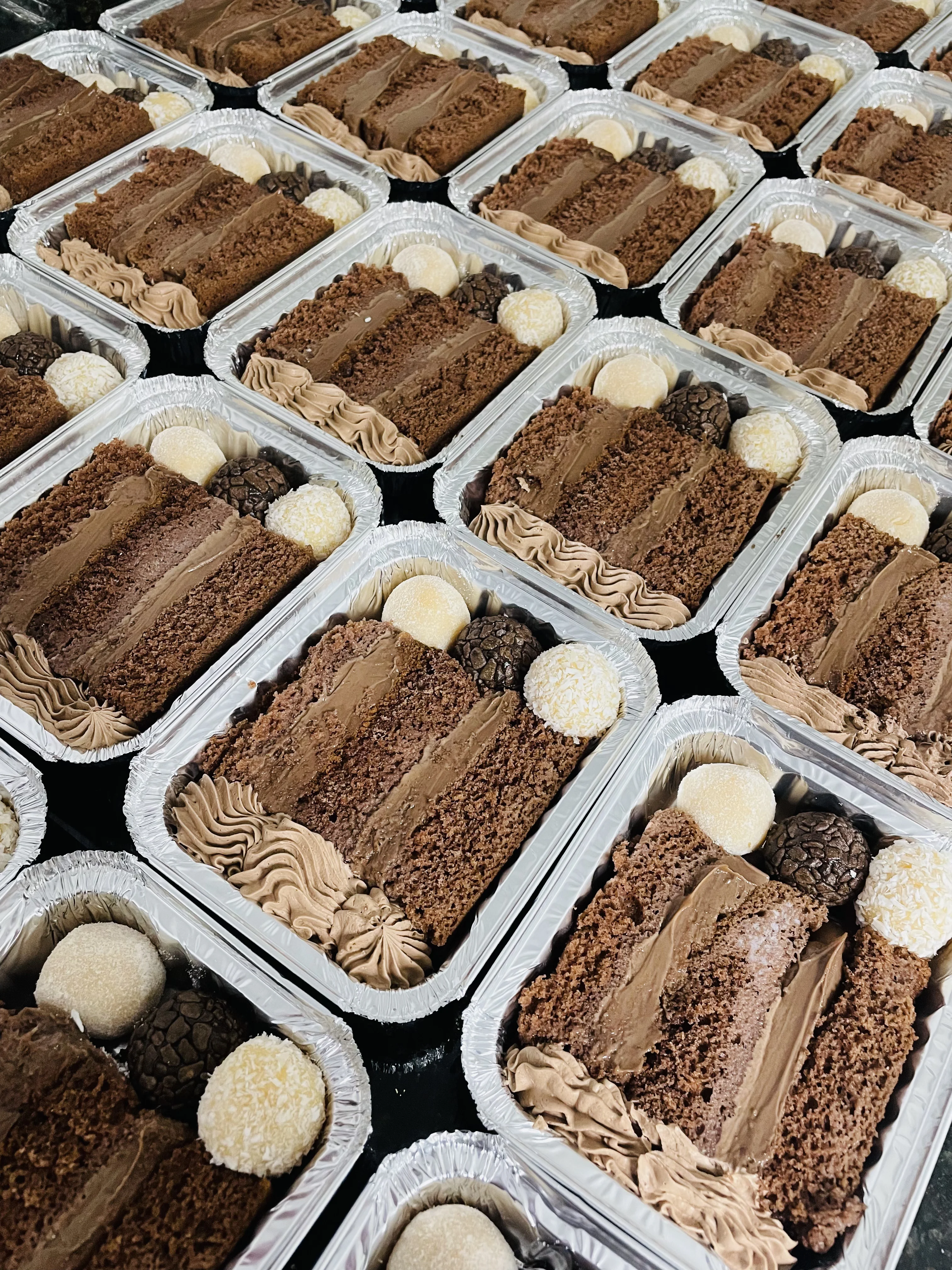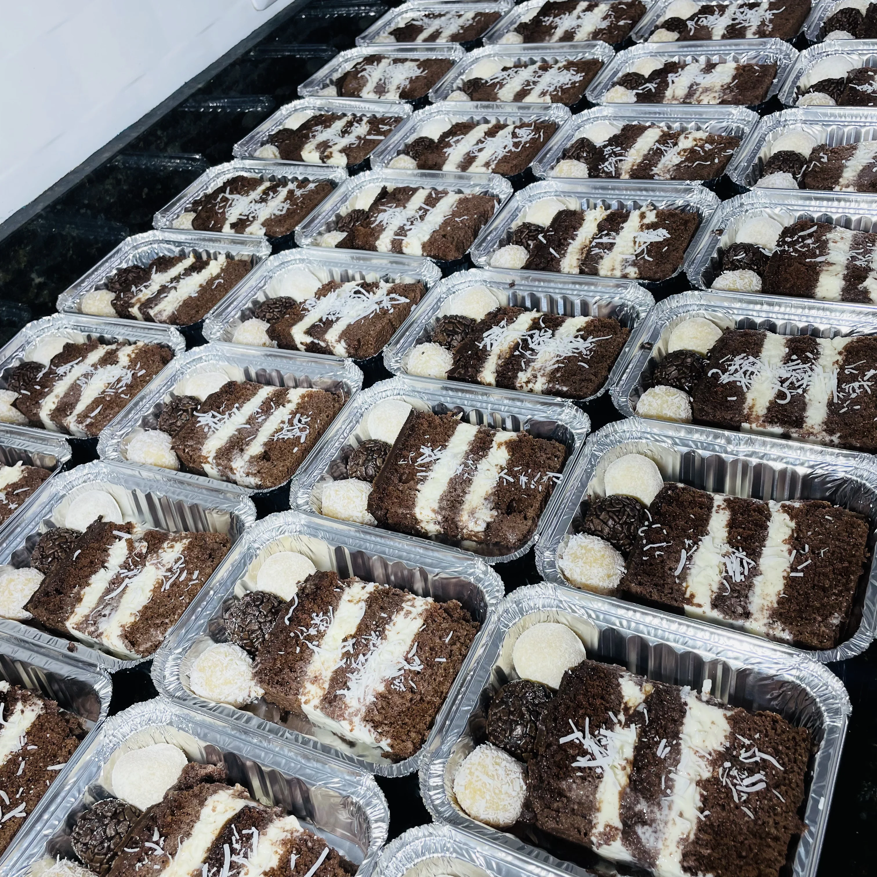 Massa de baunilha recheio de mousse de chocolate meio amargo e mousse de coco cobertura de chantilly calda de chocolate e coco