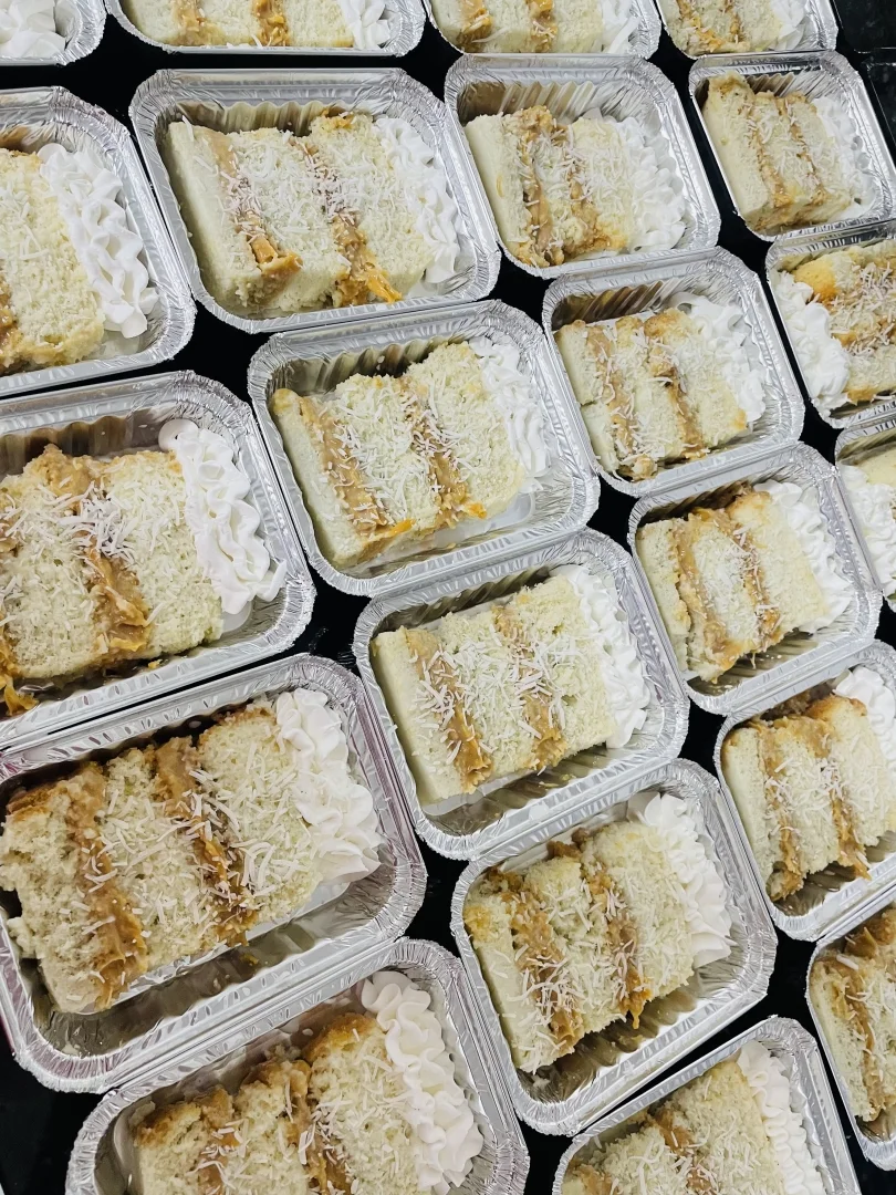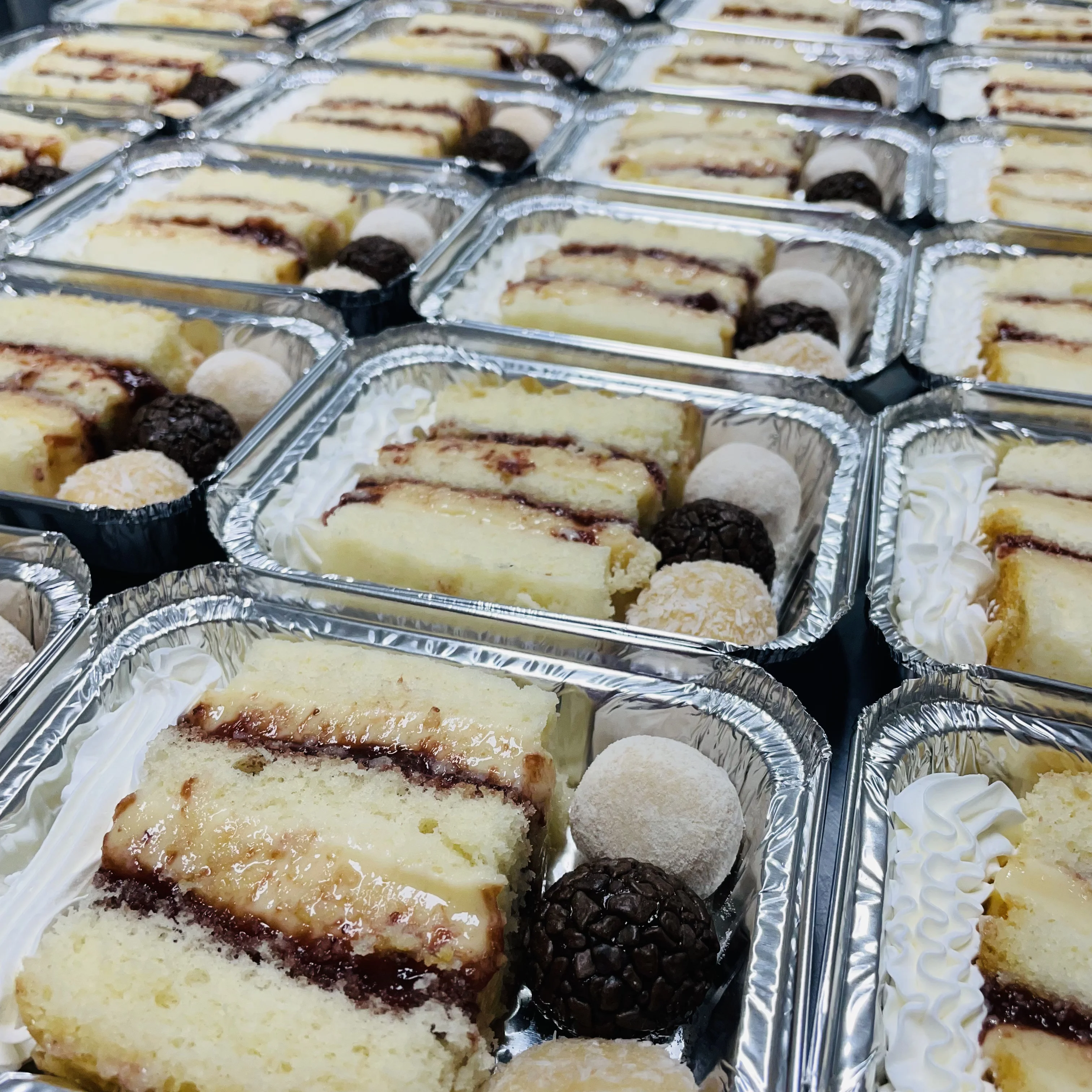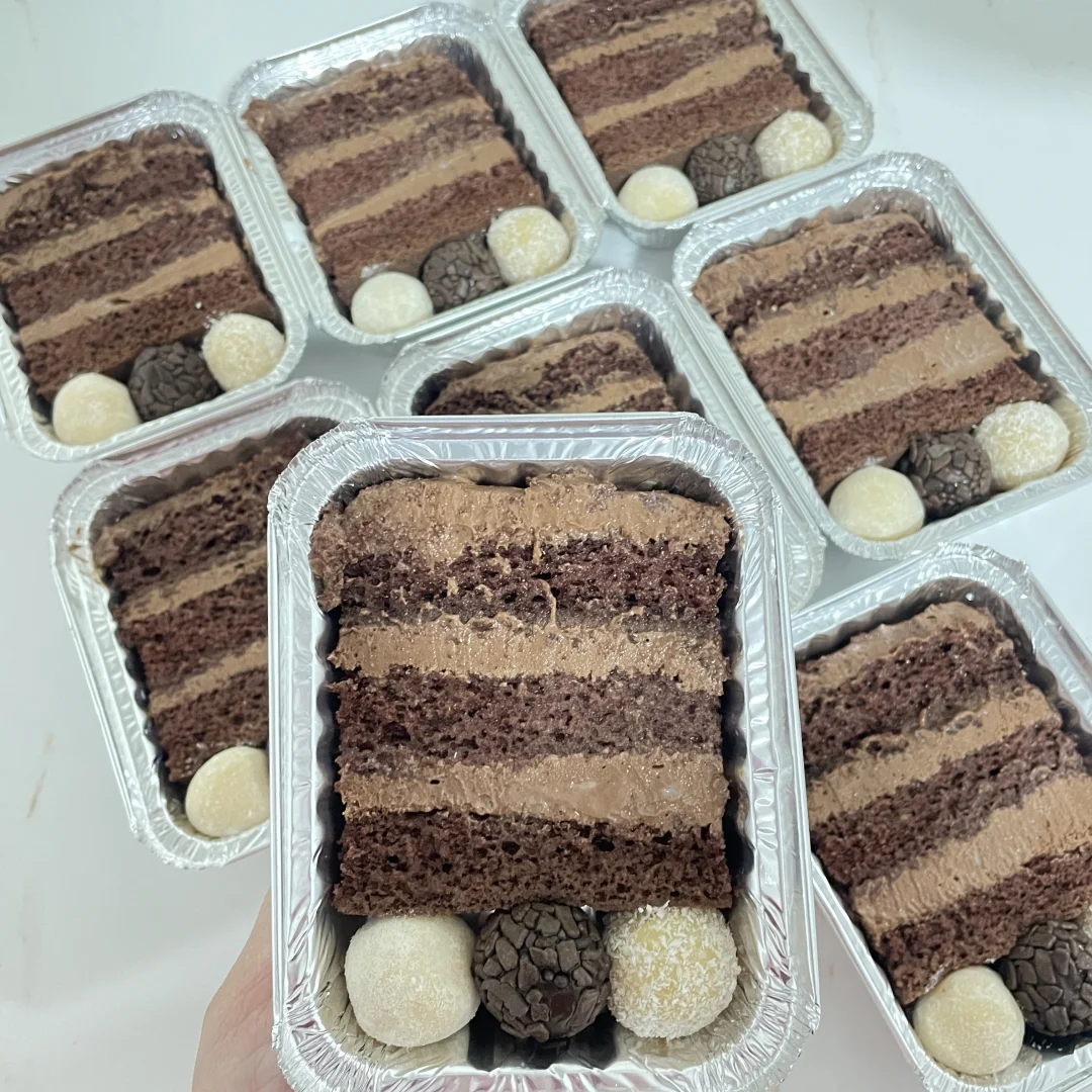 Massa de baunilha recheio de mousse de chocolate meio amargo e mousse de coco cobertura de chantilly calda de chocolate e coco